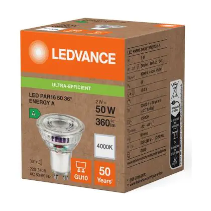 La Ledvance LED PAR16 GU10 Riflettore 2W 360lm 36D - 840 Bianco Freddo | Sostitutiva 50W è perfetta per la sostituzione della convenzionale Lampada alogena 50W GU10 con colore della luce 840 Bianco Freddo. Questa Lampada ha una forma Riflettore con un diametro di 50mm. I due perni sono distanti tra loro 10mm. Questa lampada funziona con la 220V-230V e quindi non ha bisogno di trasformatori. Passare a LED ti offrirà molti vantaggi!