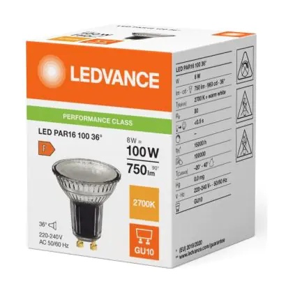 Puoi risparmiare fino al 90% tra il risparmio di energia e I costi di mantenimento grazie al basso consume di soli 8W e la lunga vita media utile di 15000 ore, comparandola invece con una lampada alogena GU10 con la sola durata di 2.000 ore. Inoltre le lampade LED non producono raggi IR e raggi UV dannosi per noi esseri umani tutto questo senza neanche produrre calore! Installarla è veramente semplice: ruotare la vecchia lampada GU10 di un quarto e rimuoverla dall’attacco. Successivamente inserire la lampada LED GU10 nell’attacco e girarla di un quarto per installarla. Questa è lampada di alta qualità Ledvance e parte da un prezzo di . Puoi usare questo prodotto come desideri grazie alla nostra garanzia totale di3 anni da Lampadadiretta.it.