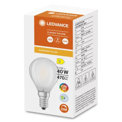 Descrizione Ledvance Superior Classic LED E14 Sferica Ghiaccio 3.4W 470lm - 940 Bianco Freddo | Dimmerabile - Miglior resa cromatica