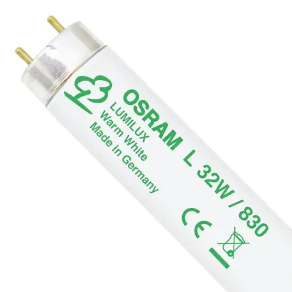 Gli Osram T8 L 32W/830 G13 ES Warm White sono tubi fluorescenti caratterizzati da una potenza di 32W e provvisti di attacco G13 che rientrano nella classe energetica 'A'. Questi tubi misurano 120cm. La vita dei medesimi é in media di 20.000 ore e l'indice di resa cromatica si pone nell'intervallo di 80-89Ra. Le loro caratteristiche tecniche assicurano un ottimo mantenimento del flusso luminoso a livelli elevati per tutta la vita della lampada. I tubi in questione profondono una luce bianca calda, corrispondente ad una temperatura di colore di 3000K.