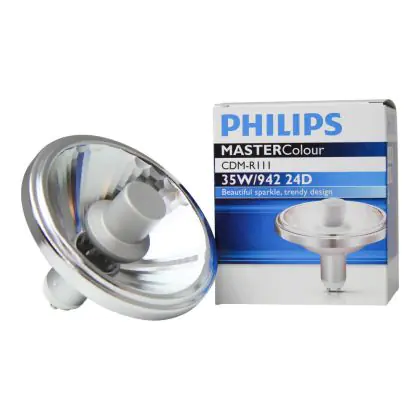 Le Philips CDM-R111 35W 942 GX8.5 24D (MASTERColour) sono lampade a scarica che combinano un design di elevata qualità ed alta efficienza. Presentano una potenza di 35W e sono dotate di attacco del tipo GX8.5. Queste lampade a scarica hanno una vita media di 9000 ore. La resa dei colori é eccezionale grazie all'indice di resa cromatica di 90-100Ra: questo sta ad indicare che le caratteristiche degli oggetti illuminati sono poste in risalto in maniera eccezionale. Queste lampade integrano la tecnologia UV-Block che consente di mantenere al meglio, nel tempo, le caratteristiche degli oggetti illuminati.