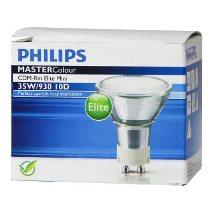 Le Philips CDM-Rm Elite Mini 35W 930 GX10 10D (MASTERColour) sono lampade a scarica ad alogenuri metallici in ceramica dotate di riflettore. Sono lampade estremamente efficienti che presentano una potenza di 35W e sono dotate di attacco del tipo GX10. Queste lampade a scarica compatte hanno una vita media di 15.000 ore e producono una vivida luce bianca brillante. La resa dei colori é eccezionale grazie all'indice di resa cromatica di 90-100Ra: questo sta ad indicare che le caratteristiche degli oggetti illuminati sono poste in risalto in maniera ottimale.