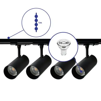 Descrizione Set completo 1-Fase Rail 1 Metro Nero | incl. 4x Faretti + GU10 2700K 3W Dimmerabile + Tappo Di Chiusura, Connettore di Alimentazione