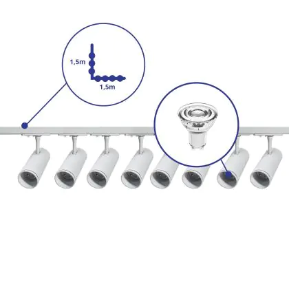 Descrizione Set completo 1-Fase Rail L 1,5 x 1,5 Metro Bianca | incl. 8x Faretti + GU10 2700K 3W Dimmerabile + Tappo Di Chiusura, Connettore di Alimentazione e L -Connettore